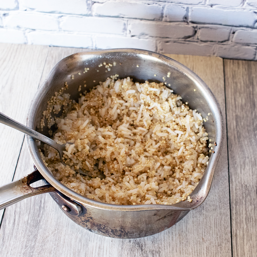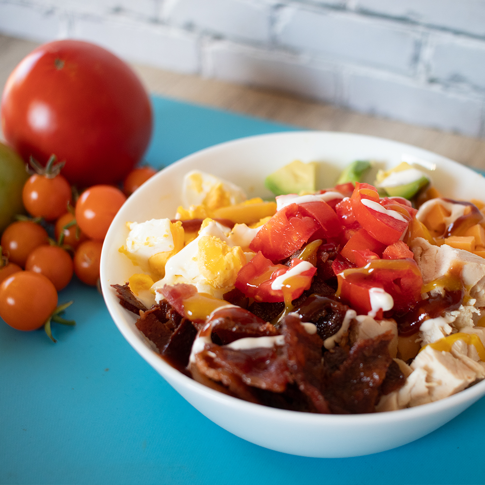 BLT bowls- rice & quinoa, bacon, eggs, chicken, garlicky tomatoes, spinach, & sauce